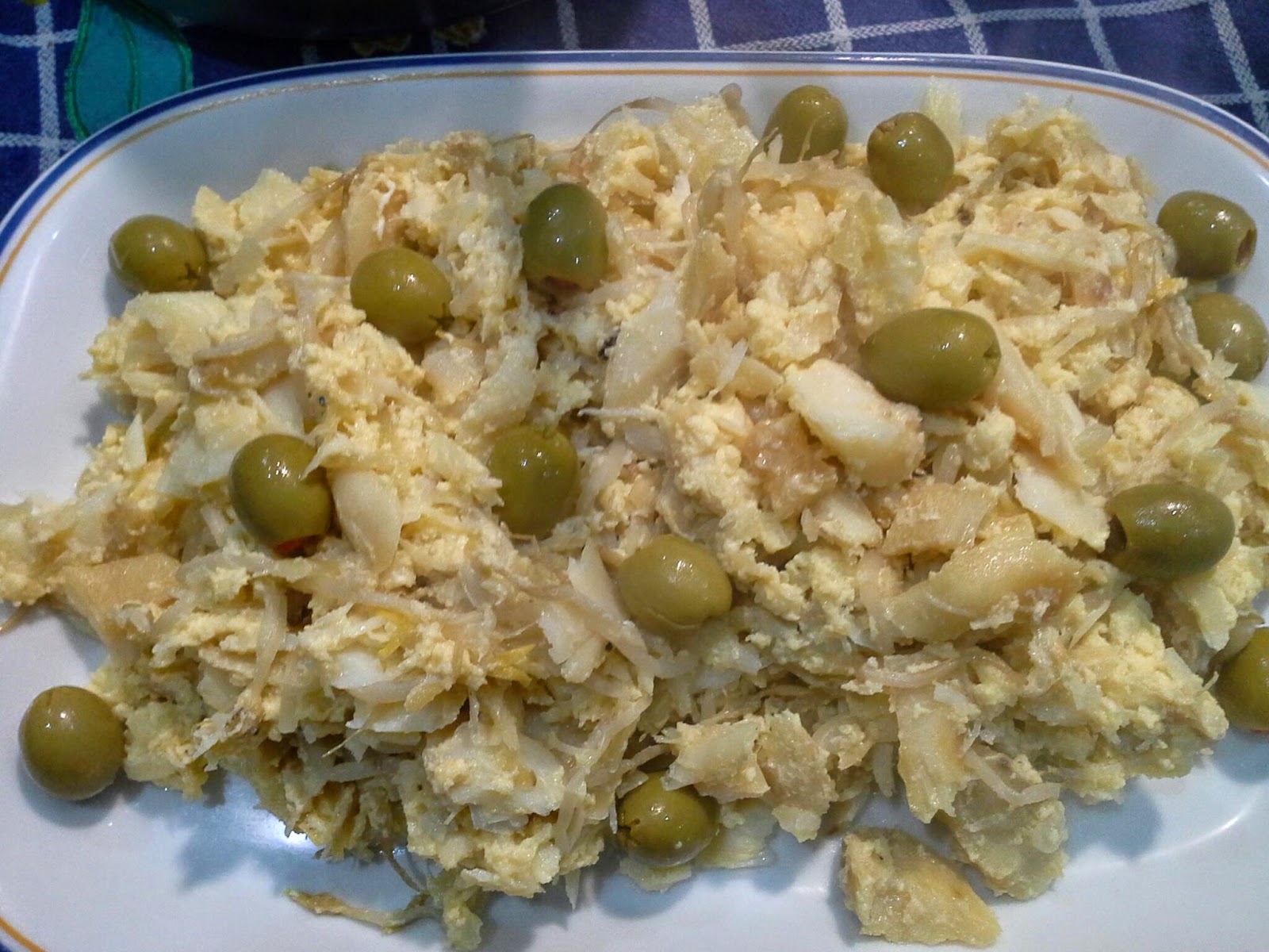 Primeiro cozi as postas de bacalhau e depois desfiz em lascas, refoguei um pouco de cebola e alho com 1 folha de louro coloquei lá o bacalhau,enquanto isso abri a lata de rebentos de soja passei por água e depois de bem escorrida juntei ao bacalhau. Deixei cozinhar um pouco só para ficar um bocadinho mais saboroso e depois juntei os ovos batidos,e mexi para juntar tudo, nesta parte não correu muito bem porque os rebentos ainda largam um pouco de água, mas ficou saboroso e comeu-se sem dar por falta da gordura das batatas fritas.
